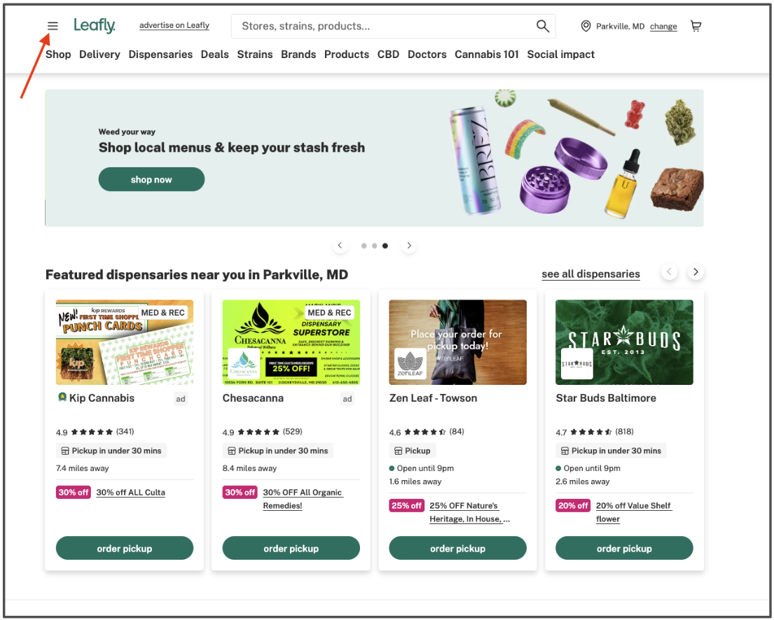- Click the Menu icon (three horizontal bars) at the top of the Leafly homepage.
