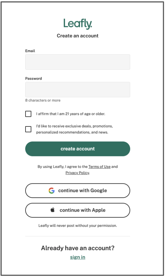 - On the signup page, enter the email and password you wish to use and read and agree to Leafly Terms of Use. After doing so, select create account.