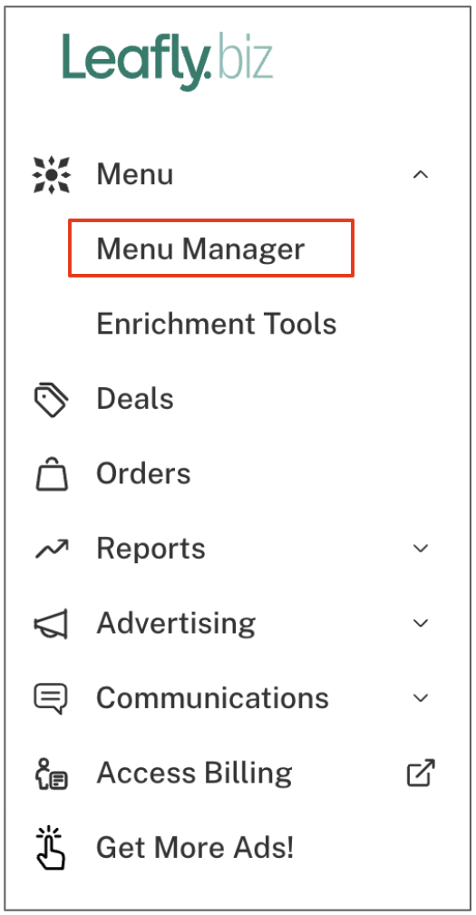If you do not see this in your Menu Manager, you are syncing with a point of sale. To discover more information, review: POS Enabled Settings