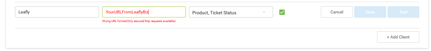 On the Webhook Integration page, click +Add Client and fill out the fields with the following values: