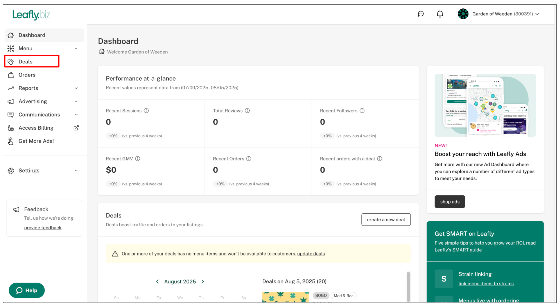 In order for your Deals to show on your Leafly Menu, the Deals need to be attached to an item. Over time, items may sell out, causing deals to either not display or only promote a partial amount of qualified items.This is why it is important to update and manage your Deals on Leafly regularly.