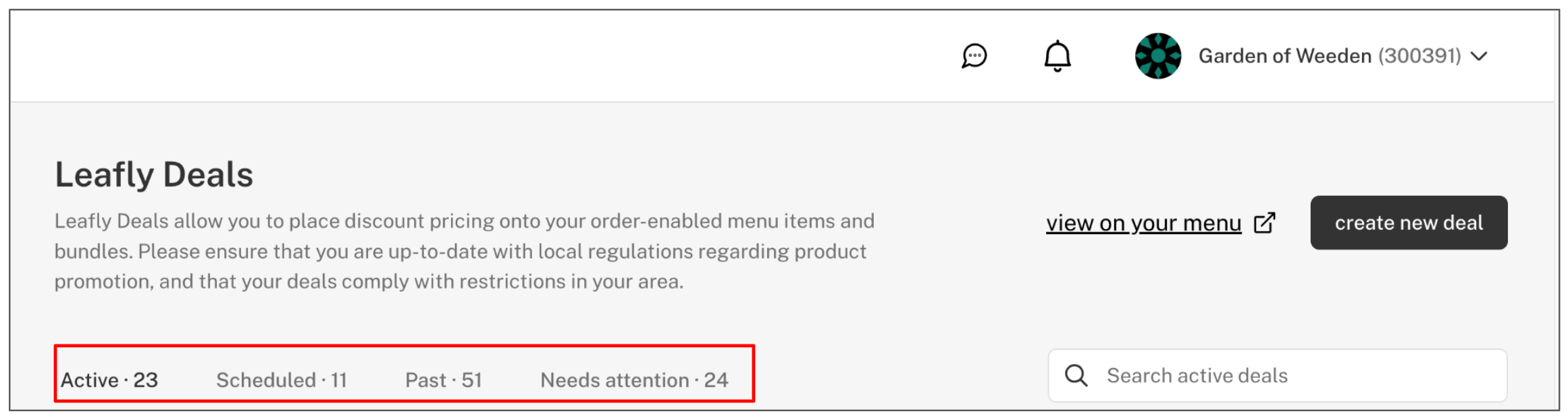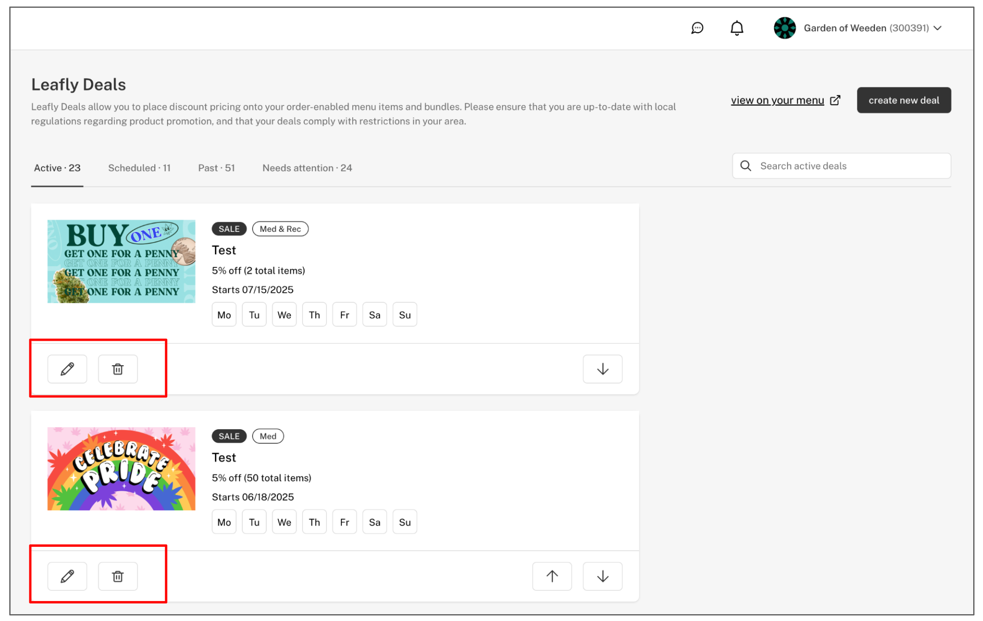 - Active: manage or delete Leafly deals that are active today