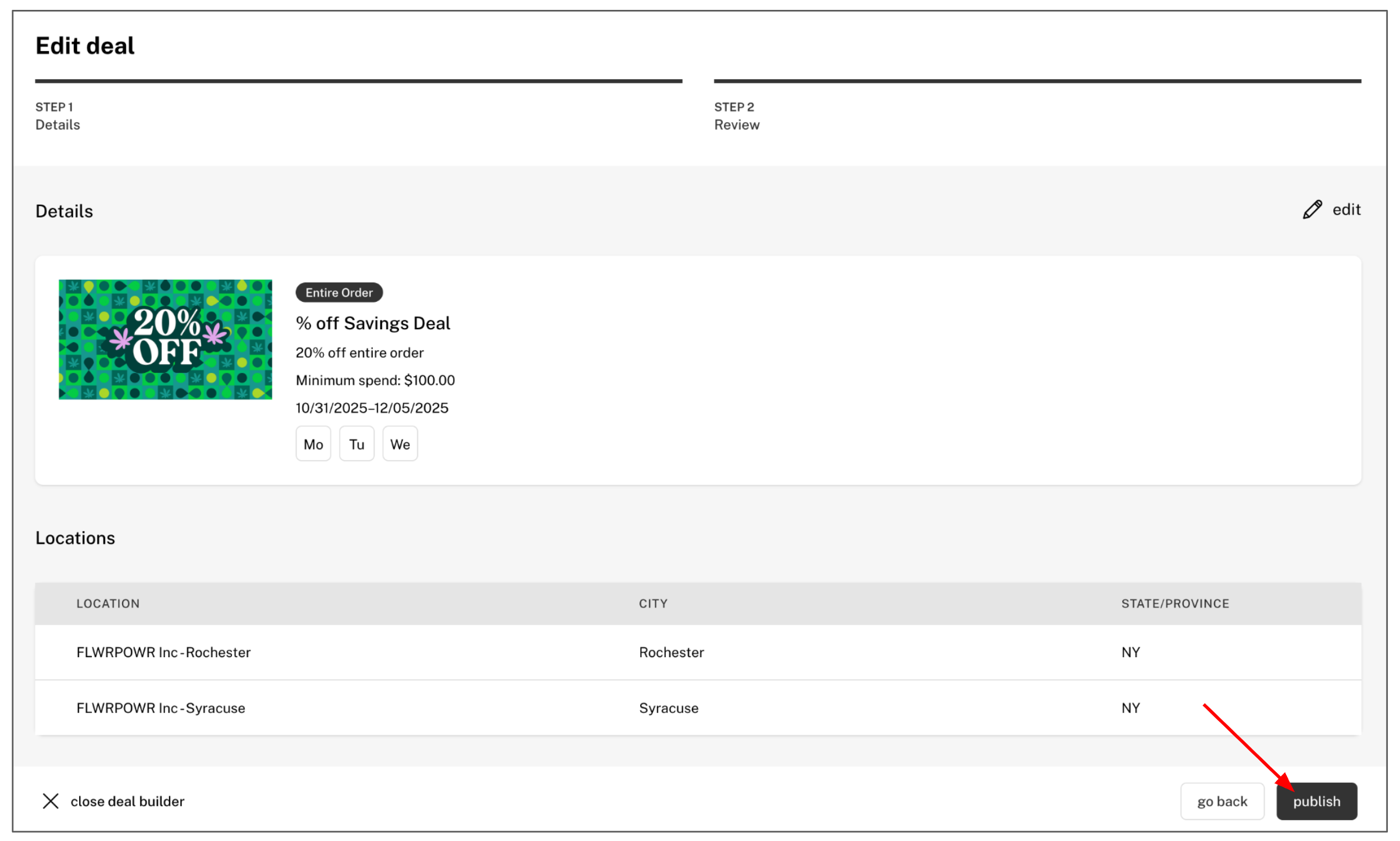 - Publish the deal. Only eligible stores (non–Info tier) will be included on publish.