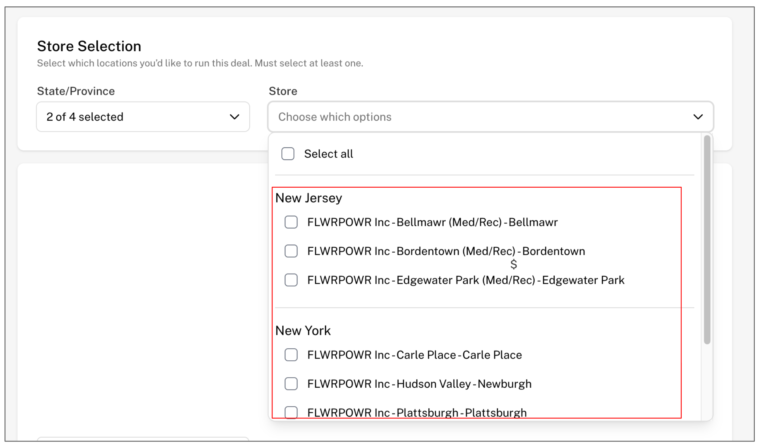 - Select the states or provinces where the deal should apply. If you manage more than one state/province, choose all that apply from the dropdown so the store list is filtered correctly.