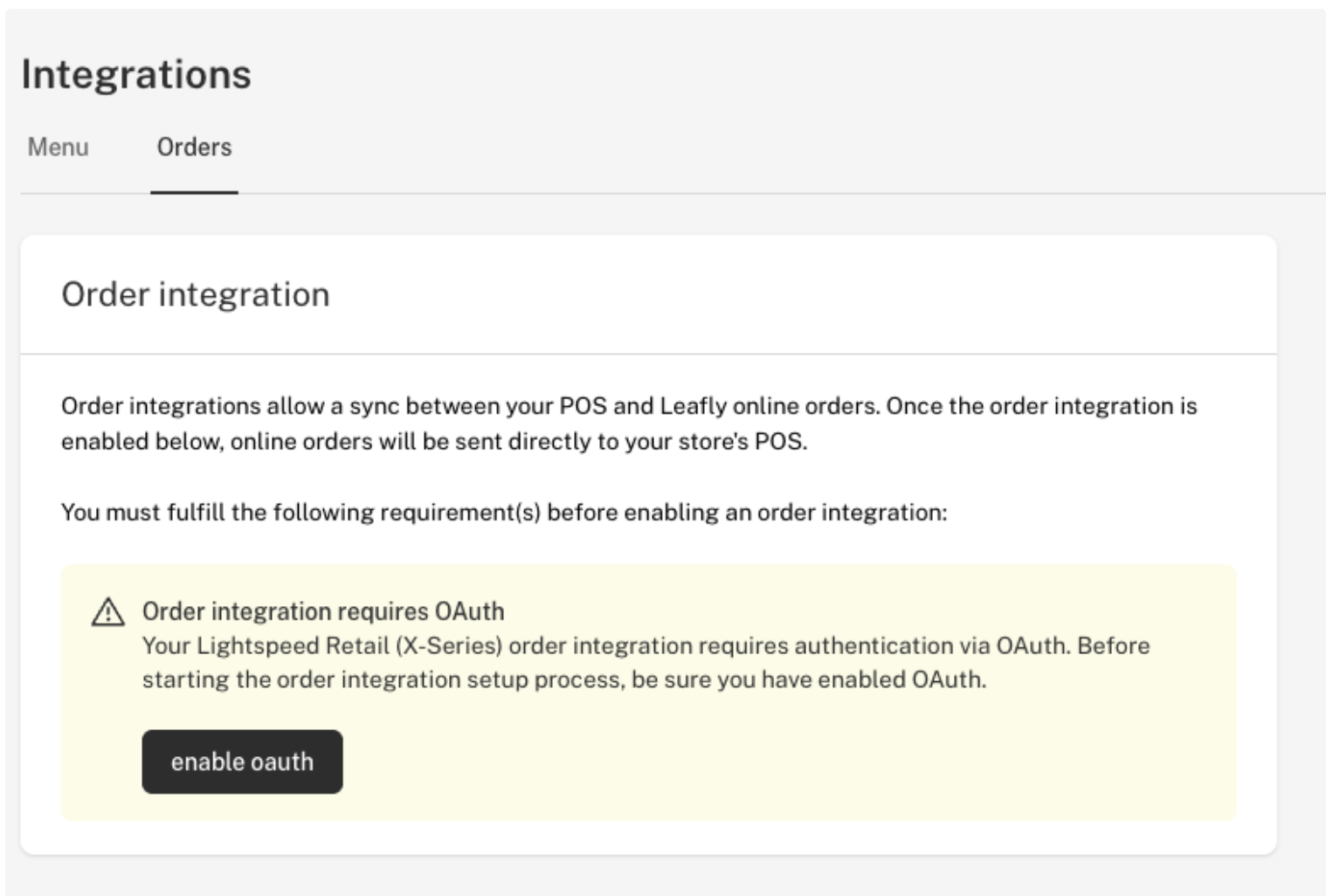 - Yes, at this time, you must have the Menu integration enabled and actively syncing before enabling the Order integration.