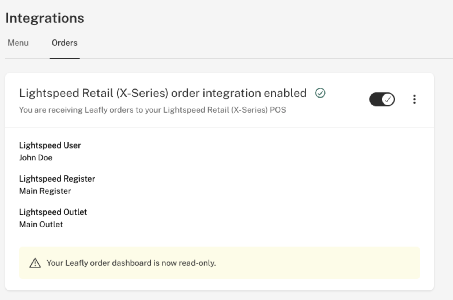 Please note that once you enable the Lightspeed X-Series order integration, your Leafly order dashboard will become read-only. While the order integration is active, order fulfillment will take place within Lightspeed X-Series.