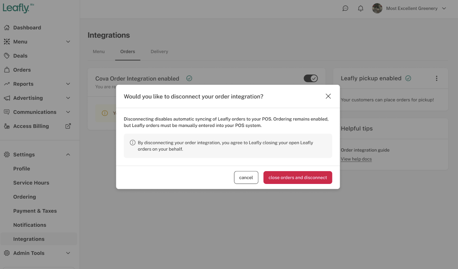Note: To disable your order integration, all open orders in your Leafly Dashboard will be closed out. You will receive the following alert to inform you of this information: